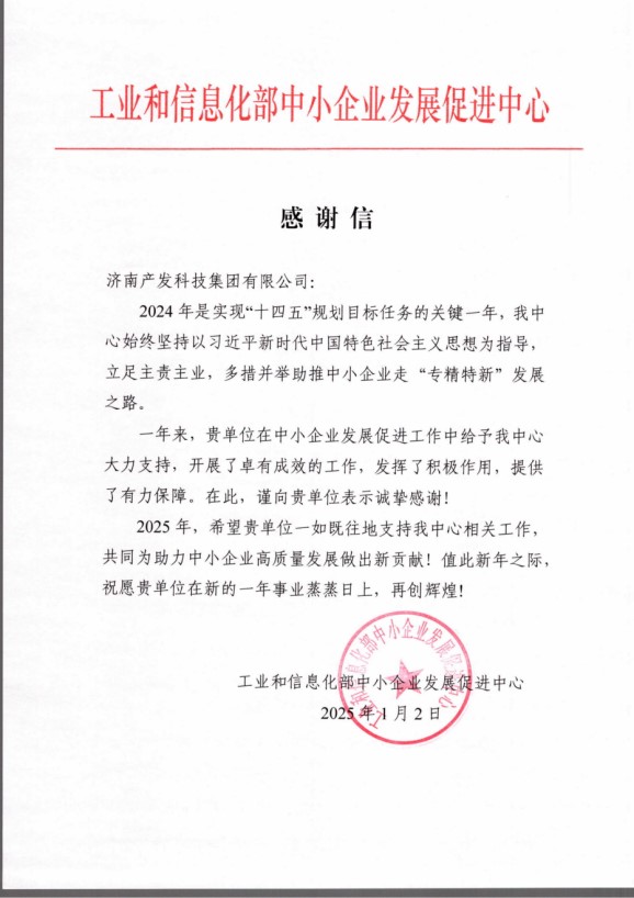 近日,濟南產(chǎn)發(fā)科技集團有限公司(以下簡稱“科技集團”)收到一封來自工業(yè)和信息化部中小企業(yè)發(fā)展促進中心(以下簡稱“促進中心”)的感謝信,信中對科技集團在2024年中小企業(yè)發(fā)展促進工作中發(fā)揮積極作用、提供有力保障表示由衷感謝。
